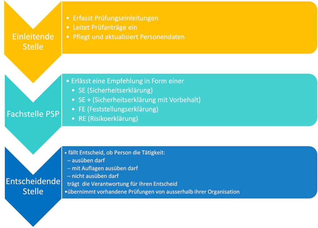 Personensicherheitsprüfungen können nur von sog. Einleitenden Stellen eingeleitet werden (vgl. Art. 31 ISG und Art. 15 VPSP). Die Fachstelle PSP VBS führt die Prüfung durch und informiert die sog. Entscheidende Stelle über das Resultat der durchgeführten Prüfung. Die Entscheidende Stelle entscheidet danach, ob die geprüfte Person die Funktion wahrnehmen darf oder nicht (vgl. Art. 41 Abs. 2 ISG und Art. 24 VPSP).