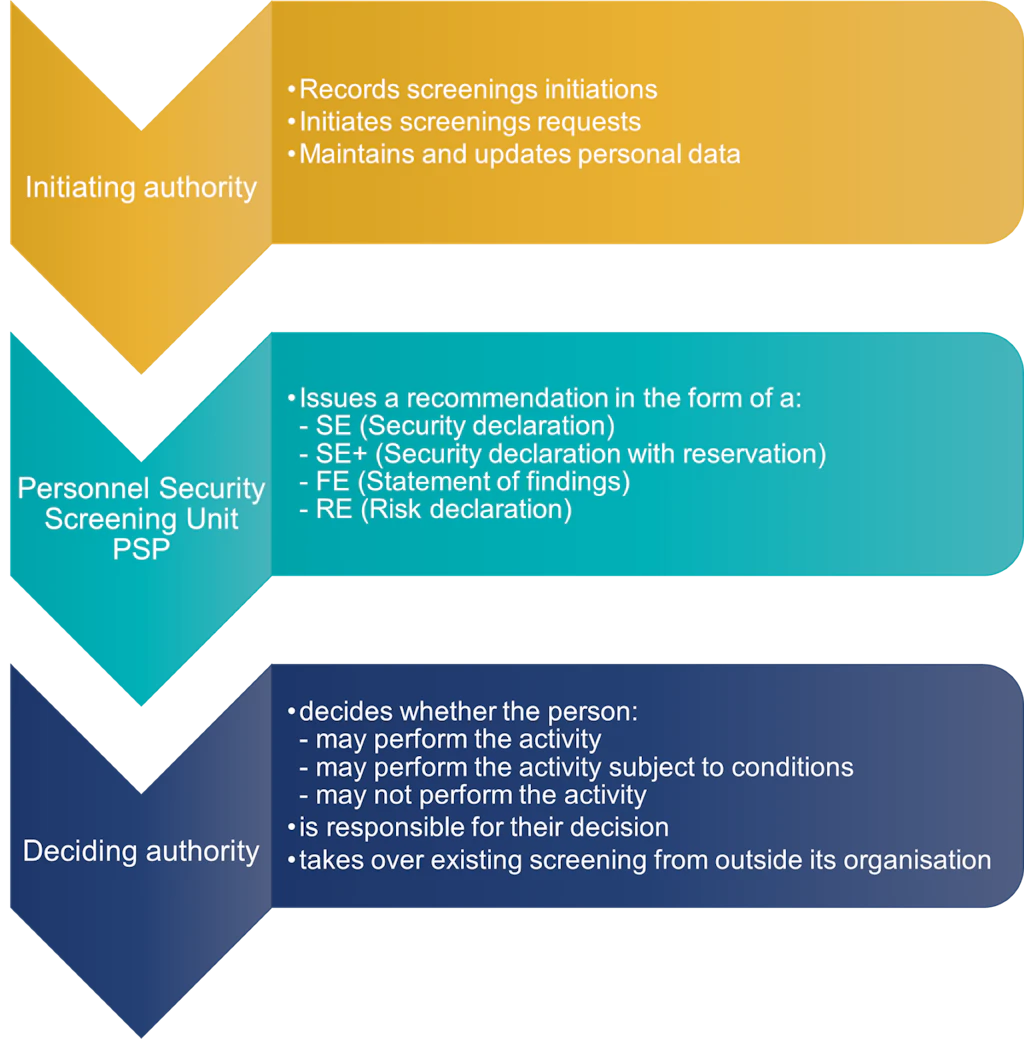 The initiating authority collects the necessary data for personnel security screening and initiates the screening process. It is typically located within the organisation itself, usually within the Human Resources department. It is responsible for determining the appropriate screening domain and the correct vetting level, and for ensuring compliance with the applicable function lists.